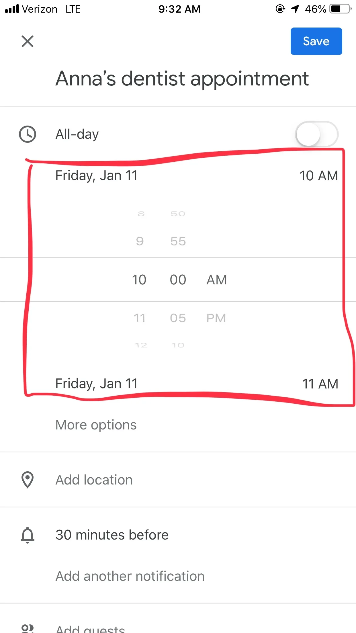 If you want your event to repeat yearly, weekly, monthly, etc., you can tap “more options.” 3. You also have the option to set an alarm to remind you. This is a lifesaver!!